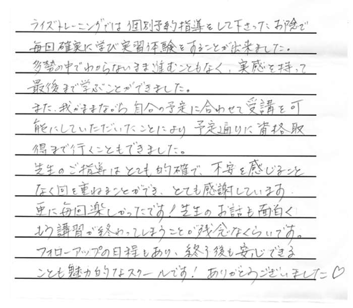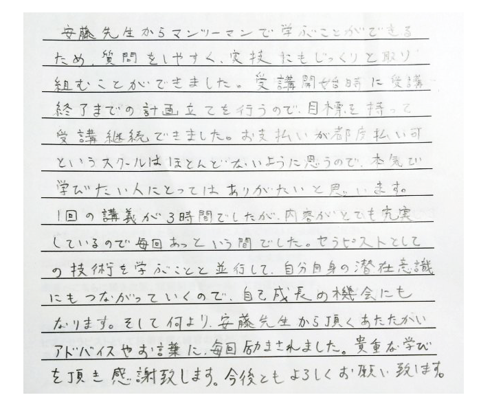 とても有難い、たくさんの学びと気づきを得ることができたとても濃い10カ月でした。途中いろいろとご心配をおかけしたりしましたが親身なってご対応していただき、おかげさまでなんとか最後までこぎつけることができました。心から感謝いたします。ありがとうございました。